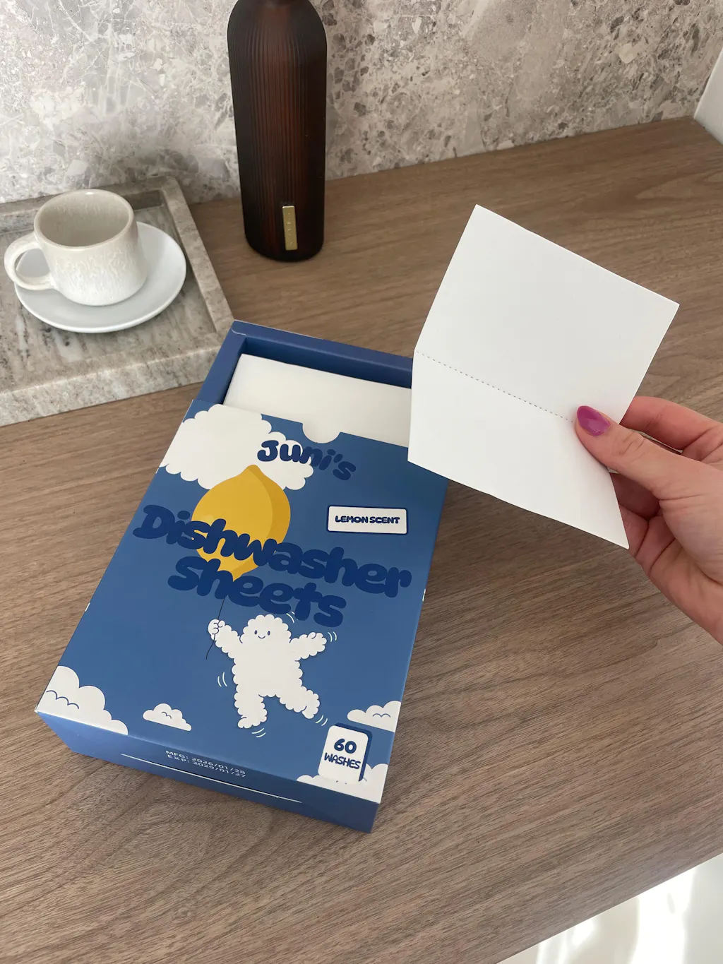 Jeden papírek hodíš do myčky. Rozpustí se. Udělá svou práci. A obal? Taky se rozpustí. Žádný plast, žádný odpad. Po mytí ti zbyde čisté nádobí a dobrý pocit.